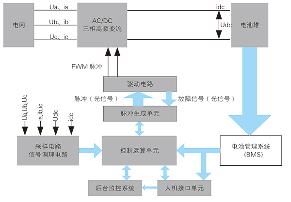 ◎儲能變流器:工頻變壓器隔離,主電路采用一級變換拓撲。主要用于完成直流母線和交流母線之間的能量交互。