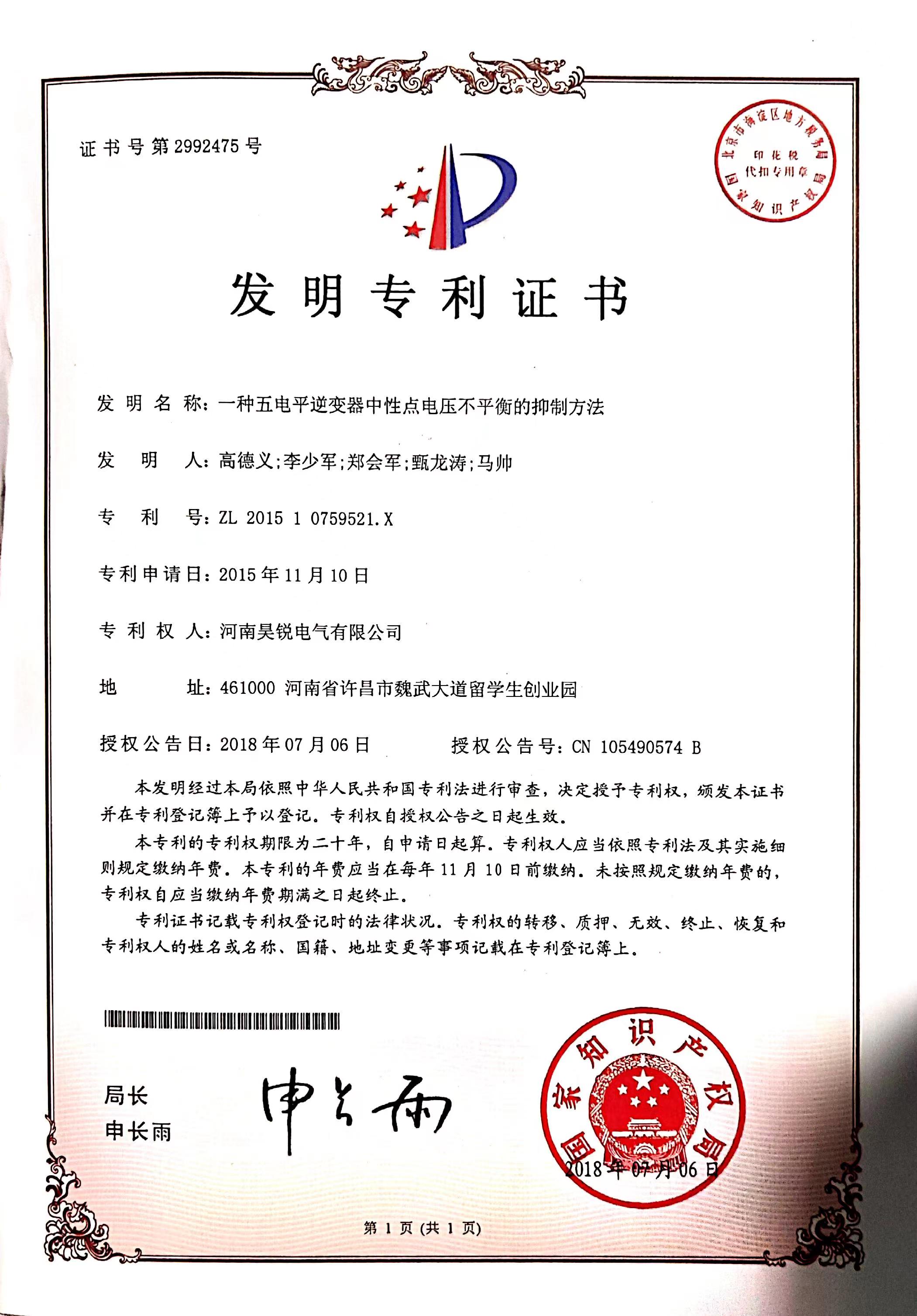 河南昊銳電氣有限公司獲一種五電平逆變器中性點電壓不平衡的抑制方法專利。專利號:201510759521X